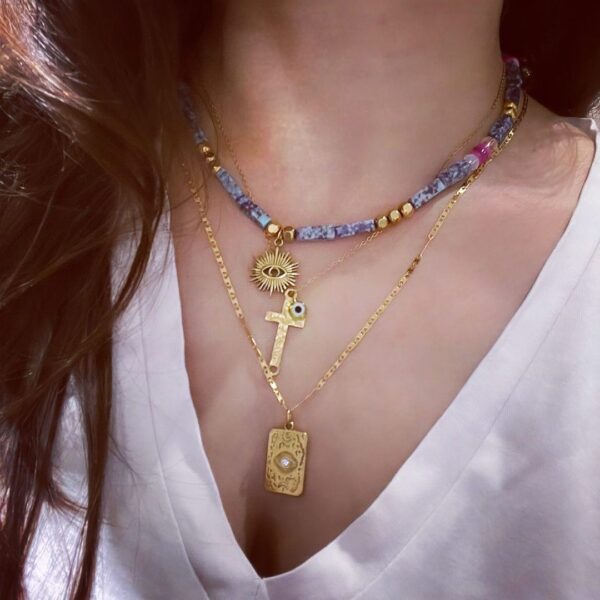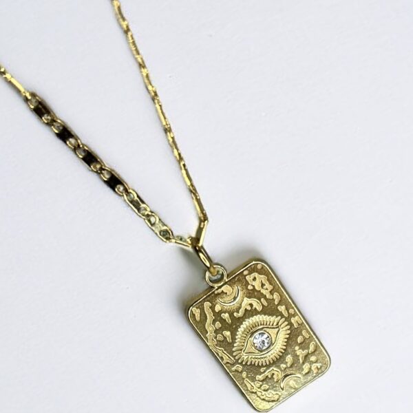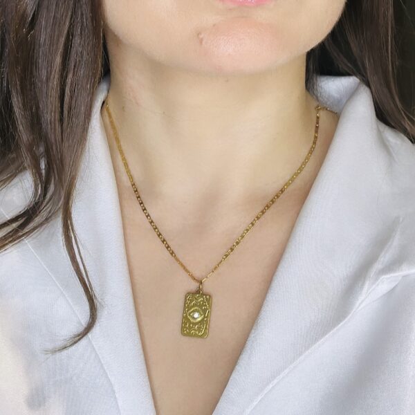 Χρυσό μενταγιόν από ατσάλι με φυλαχτό-μάτι. Το μήκος του κολιέ μεγαλώνει ή μικραίνει ανάλογα με το πως σας αρέσει να το φορέσετε κάθε φορά.