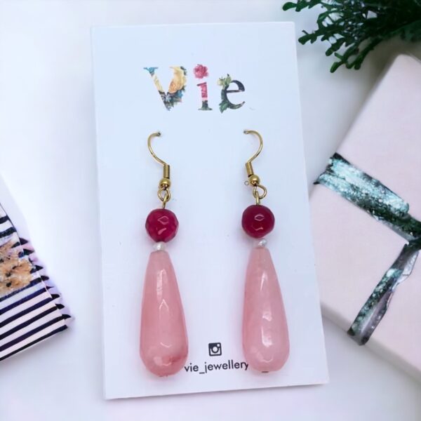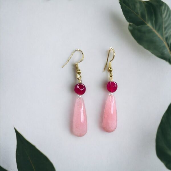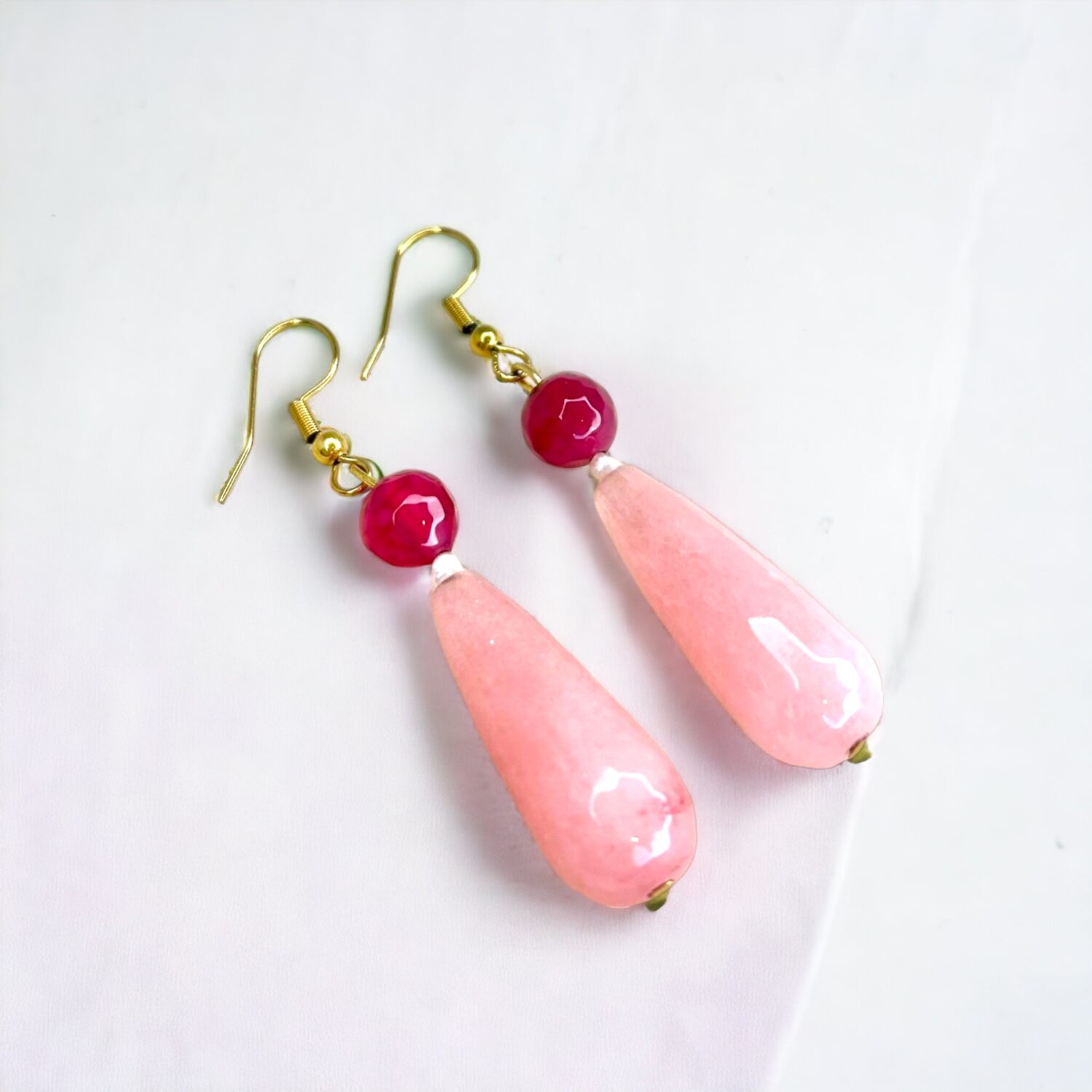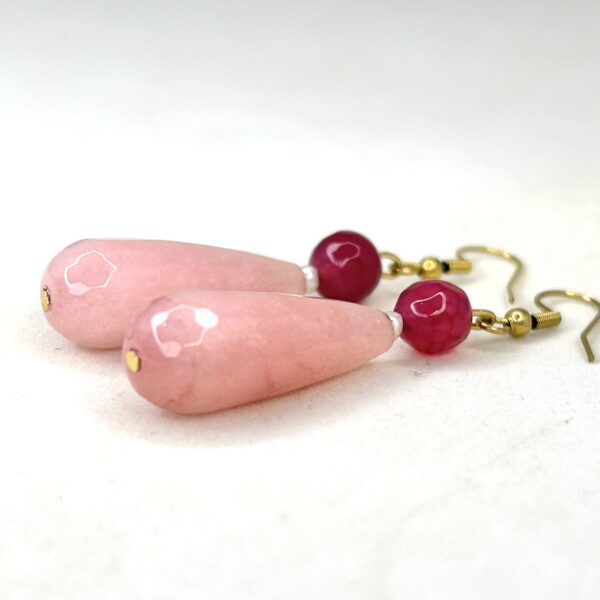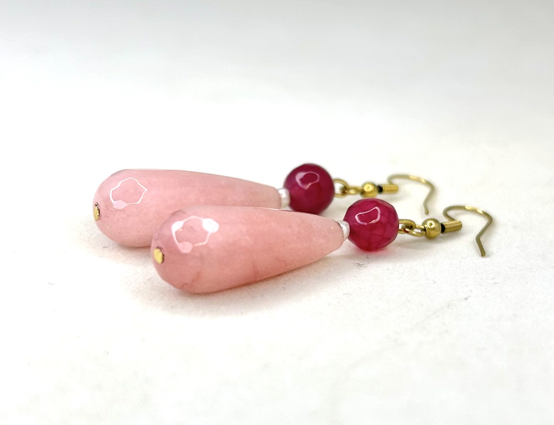Κρεμαστά σκουλαρίκια με φούξια χάντρα αχάτη, δάκρυ ροζ νεφρίτη και μαργαριταράκι.