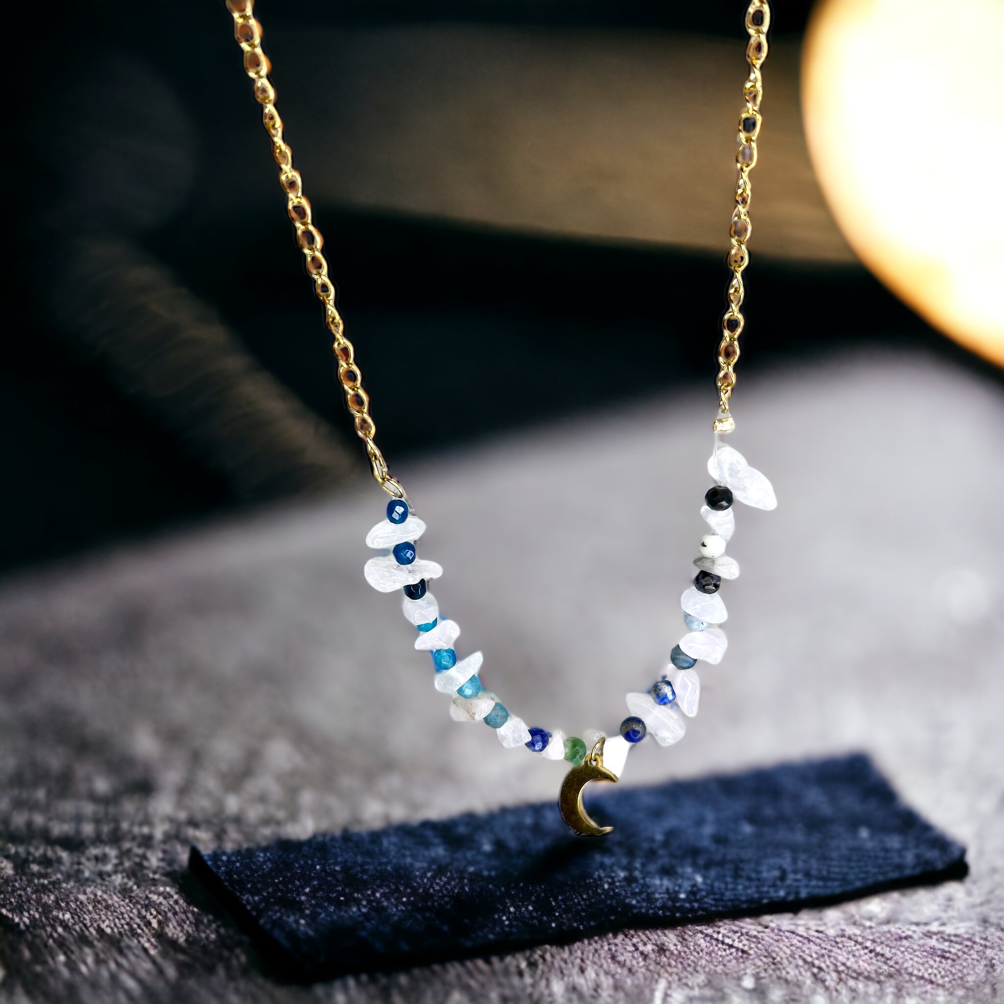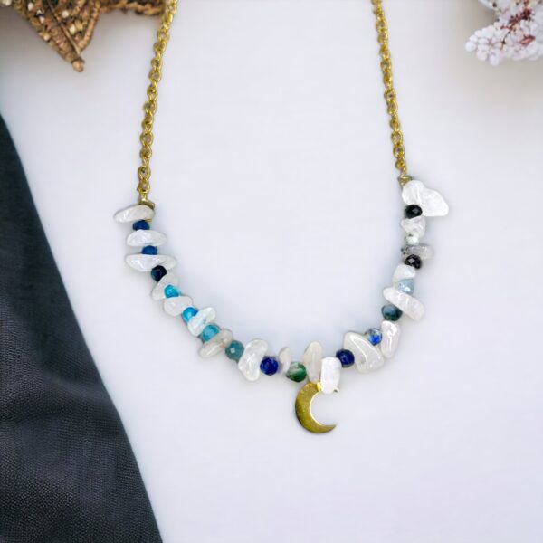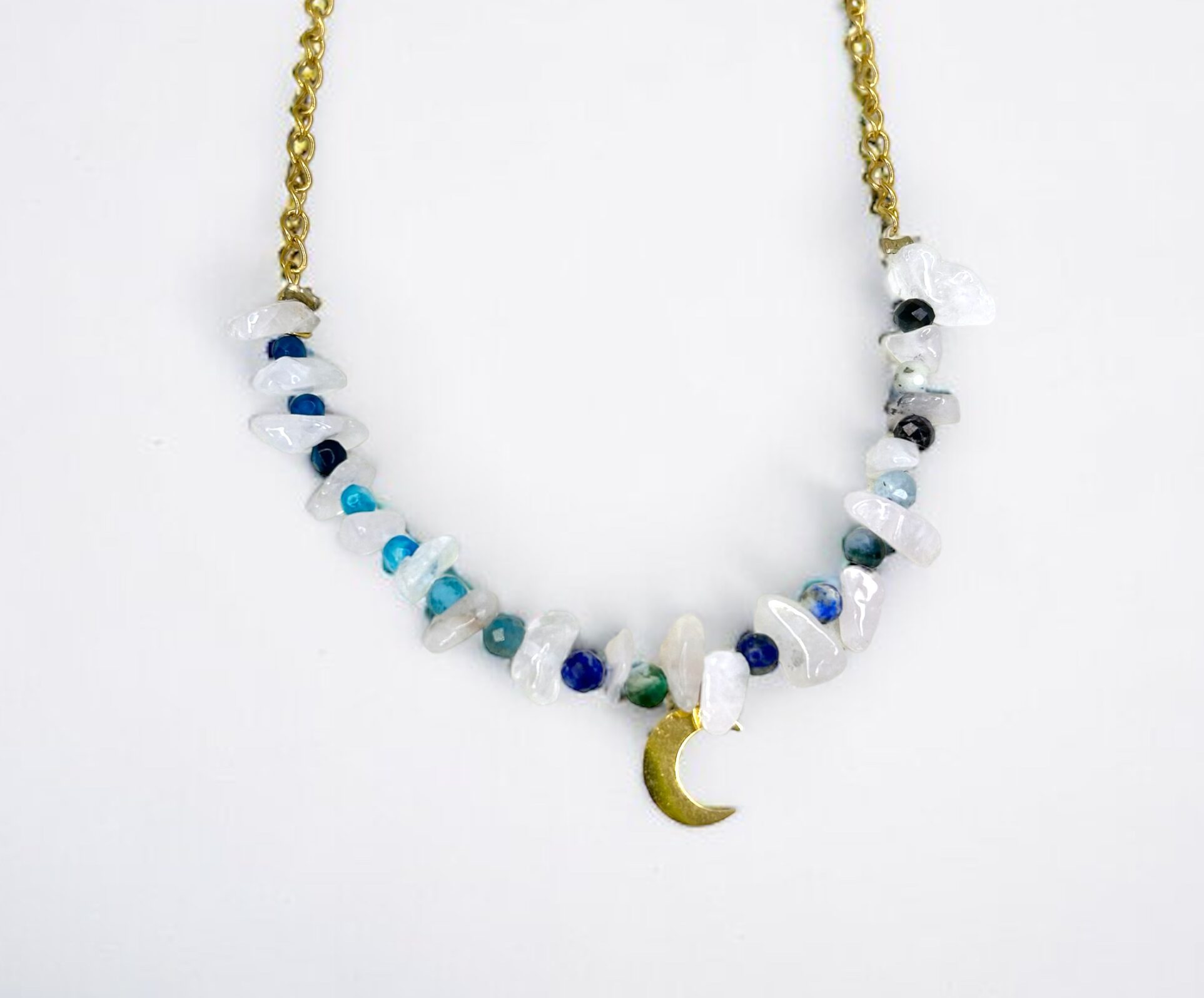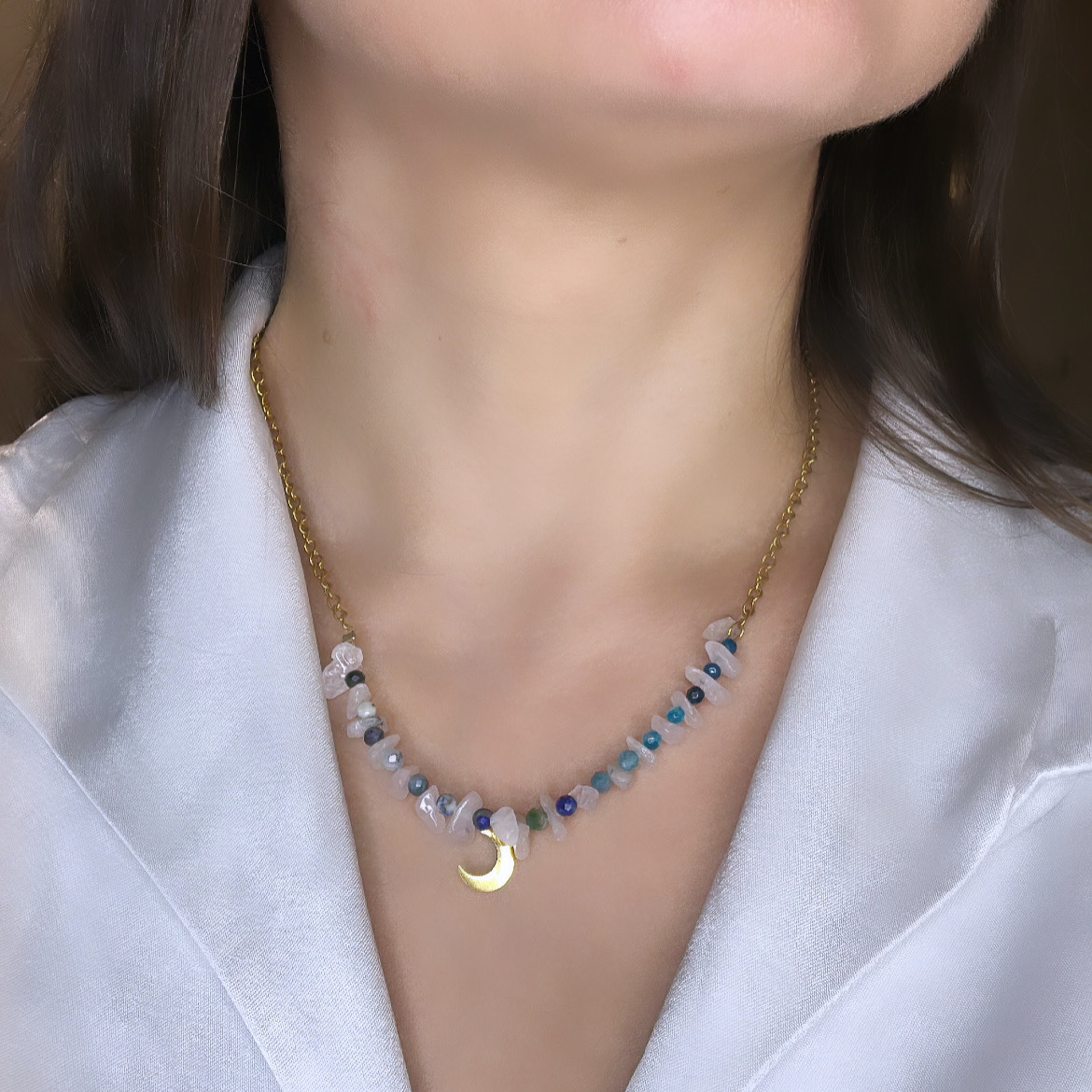 Κολιέ με γαλάζιες πέτρες αχάτη, τσιπς από ροζ χαλαζία και χρυσό ατσάλινο φεγγαράκι. Το μήκος του κολιέ μεγαλώνει ή μικραίνει ανάλογα με το πως σας αρέσει να το φορέσετε κάθε φορά.