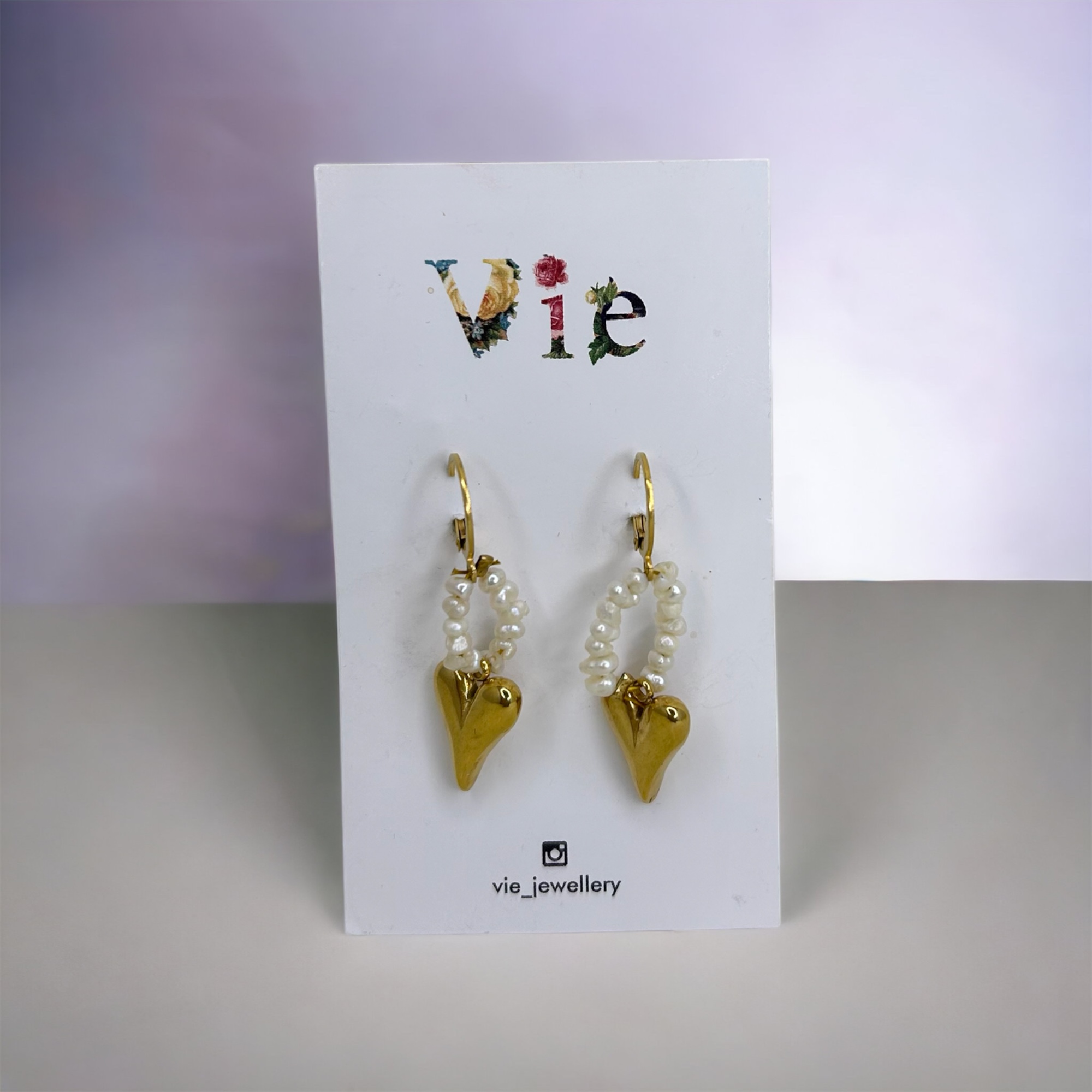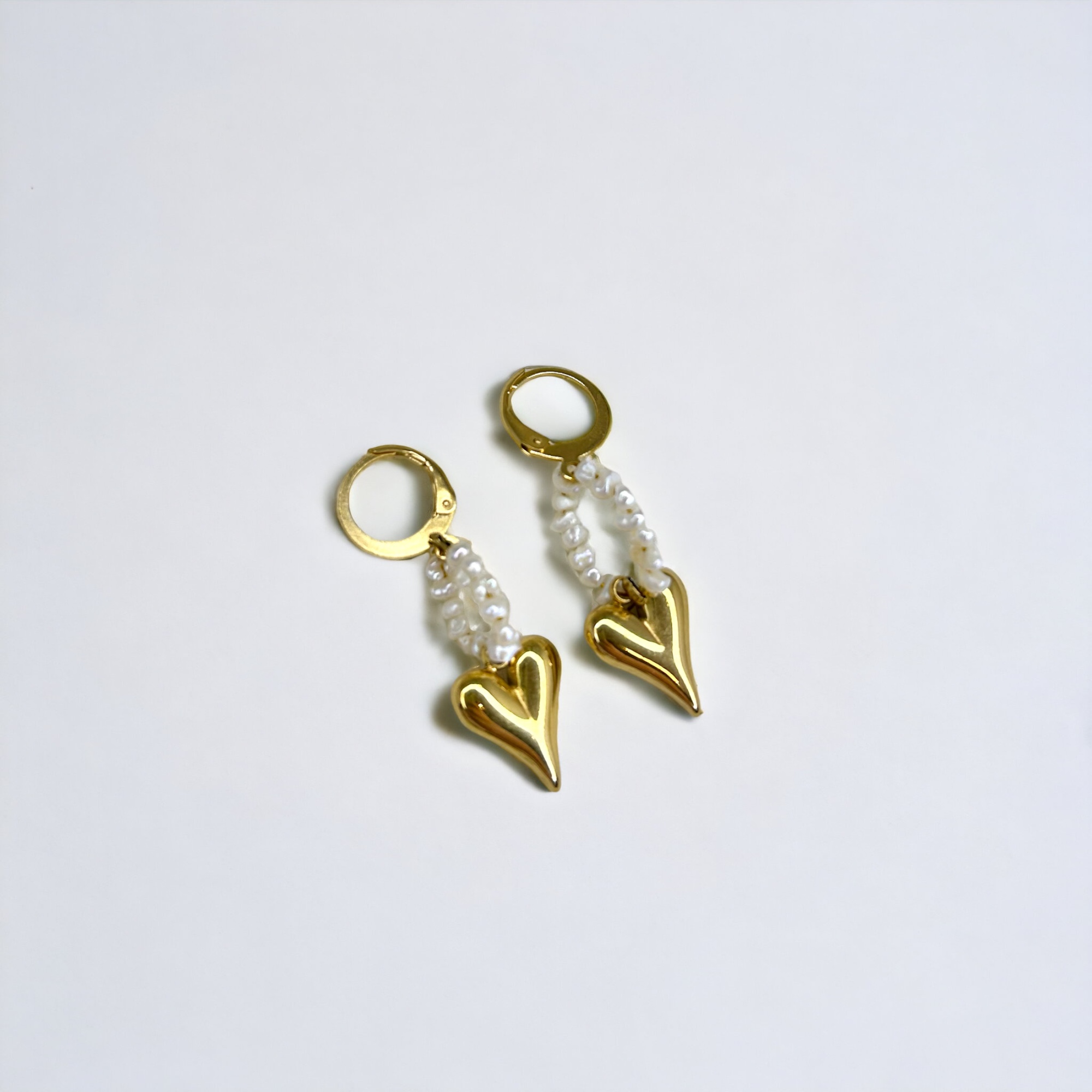 Σκουλαρίκια με μαργαριτάρια καλλιέργειας και χρυσές καρδίες από ατσάλι.