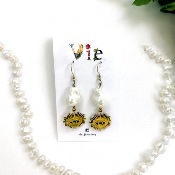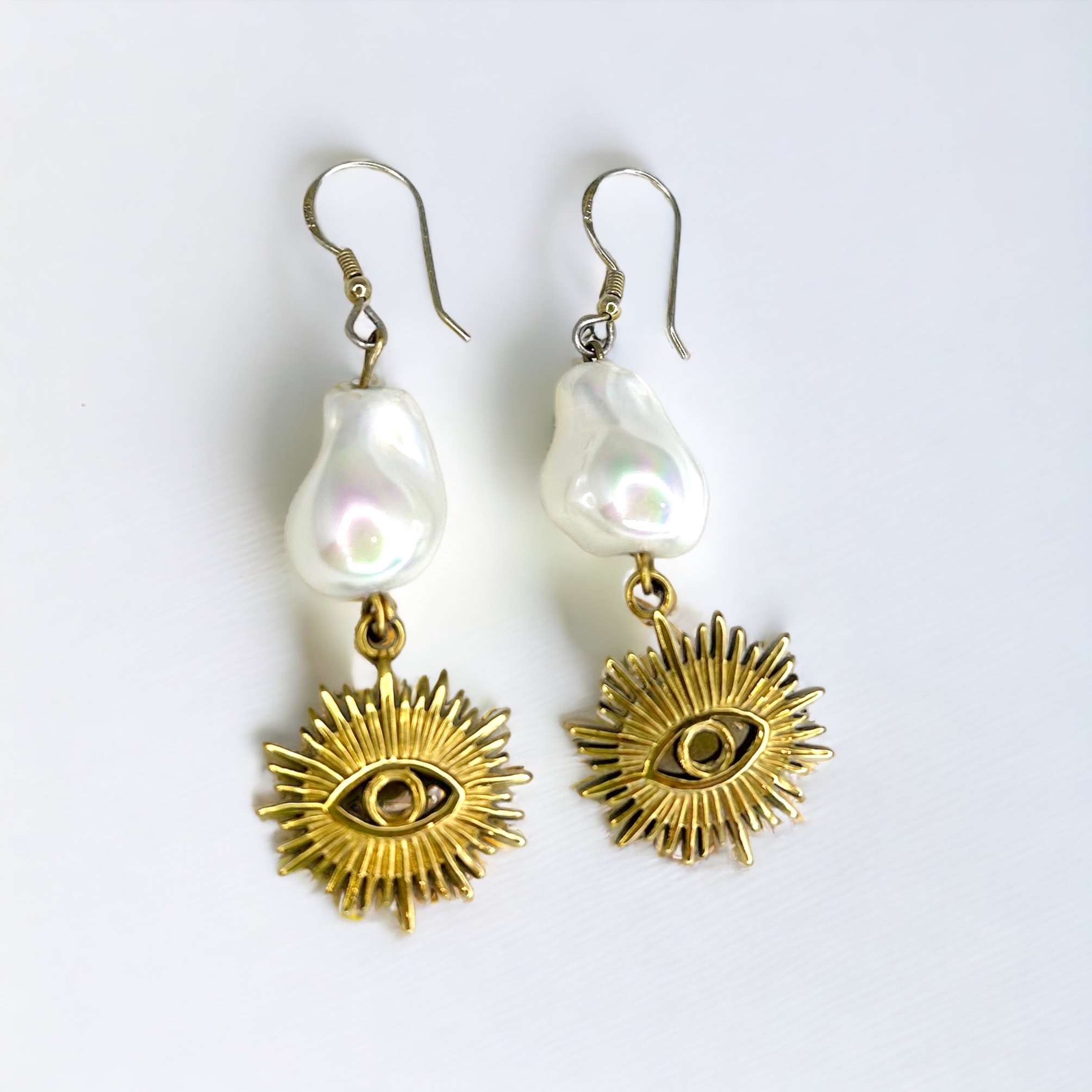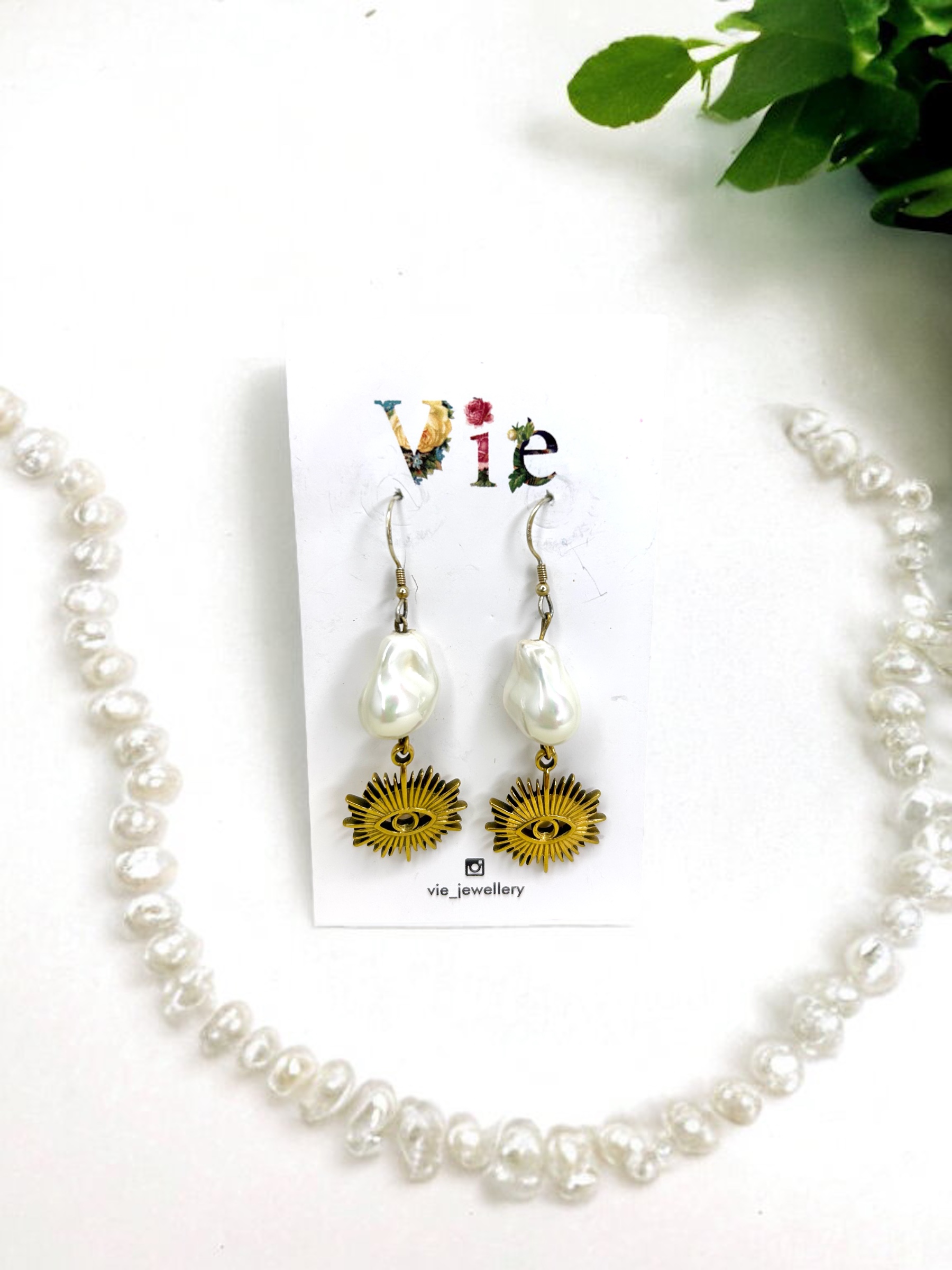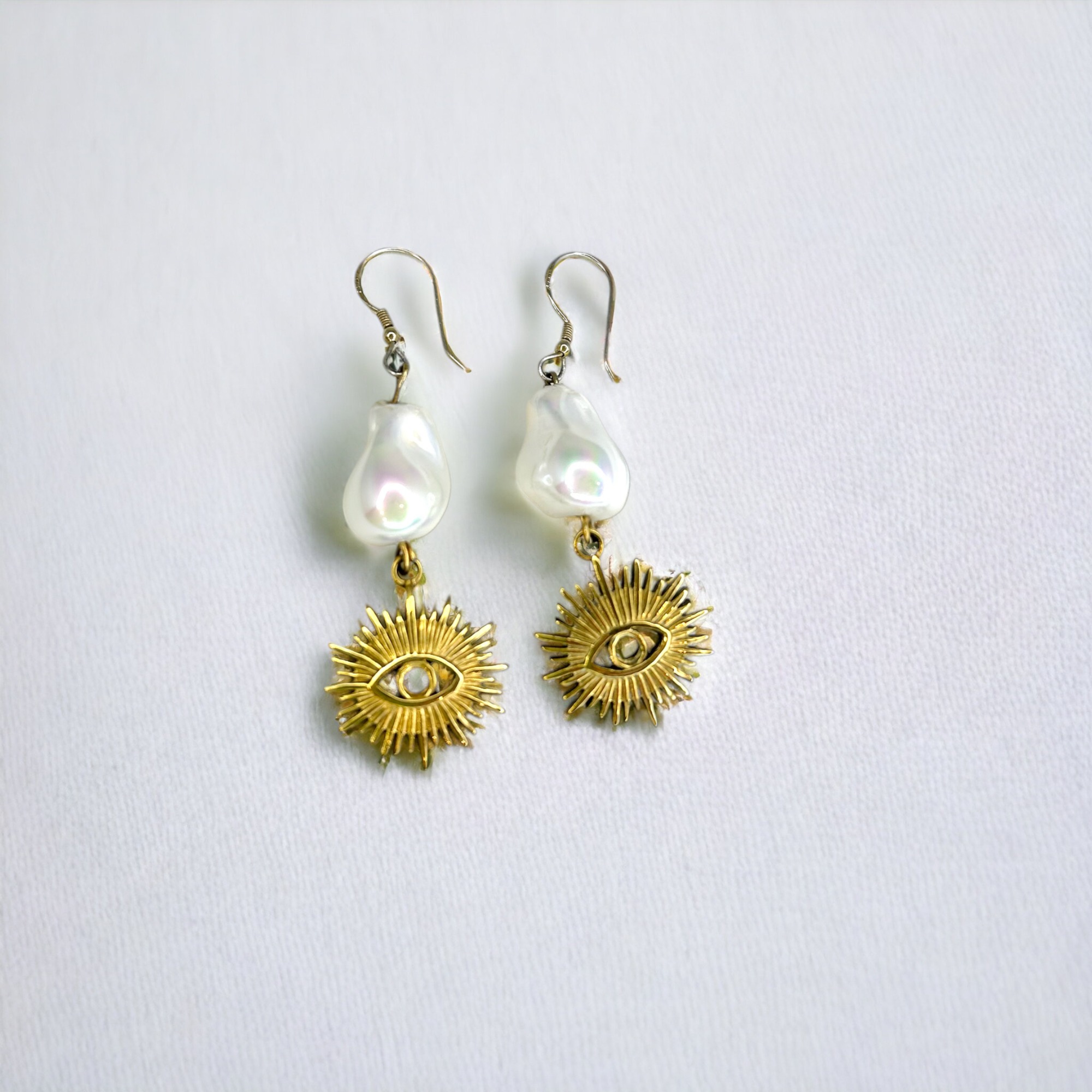Σκουλαρίκια με μεγάλο μαργαριτάρι και χρυσό ήλιο