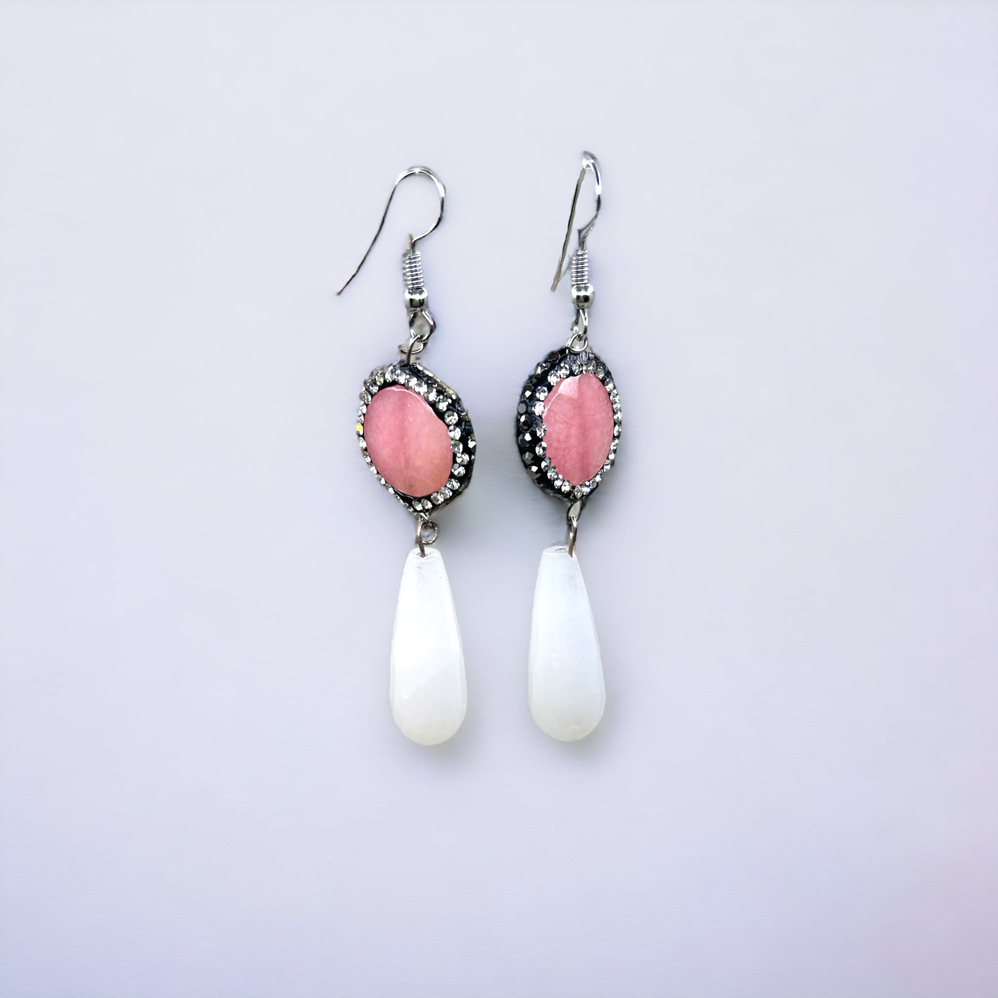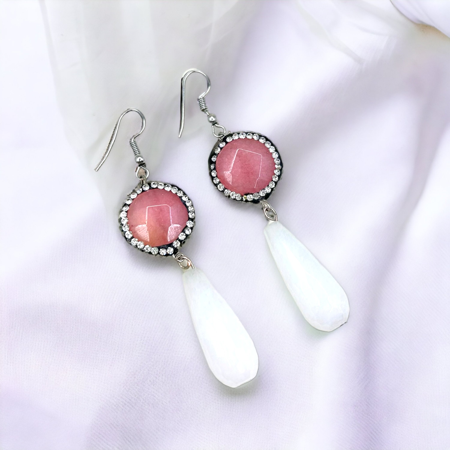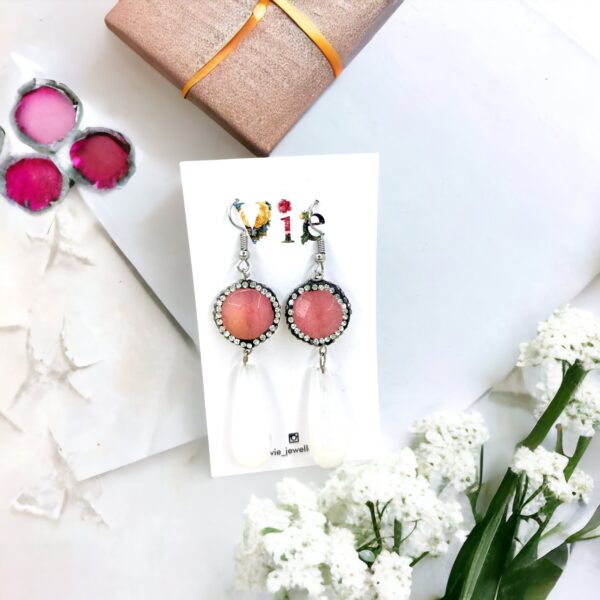 Κρεμαστά σκουλαρίκια με ρόζ επιμεταλλωμένο αχάτη με κρύσταλλα και λευκό νεφρίτη σε σχήμα σταγόνας.