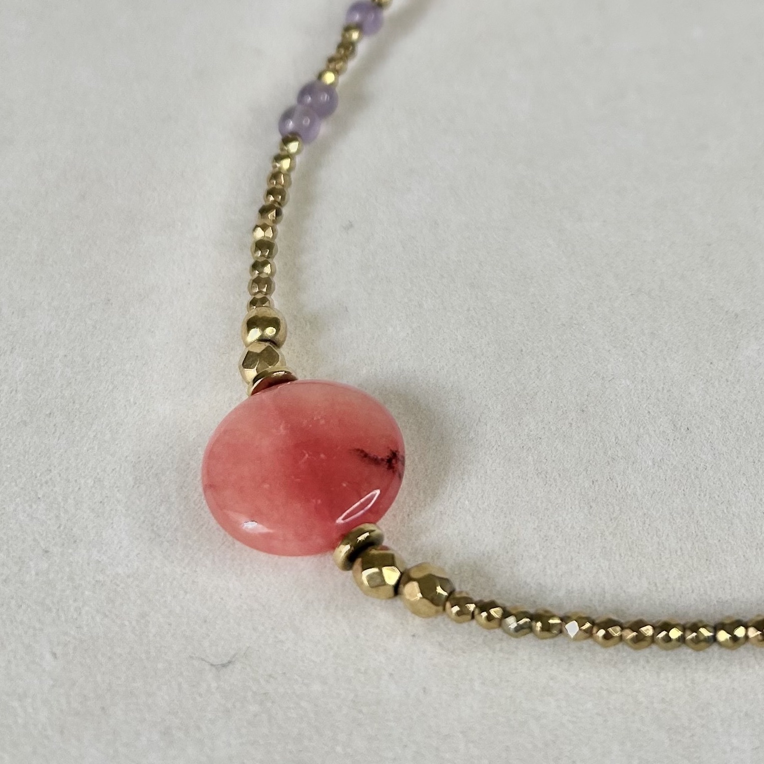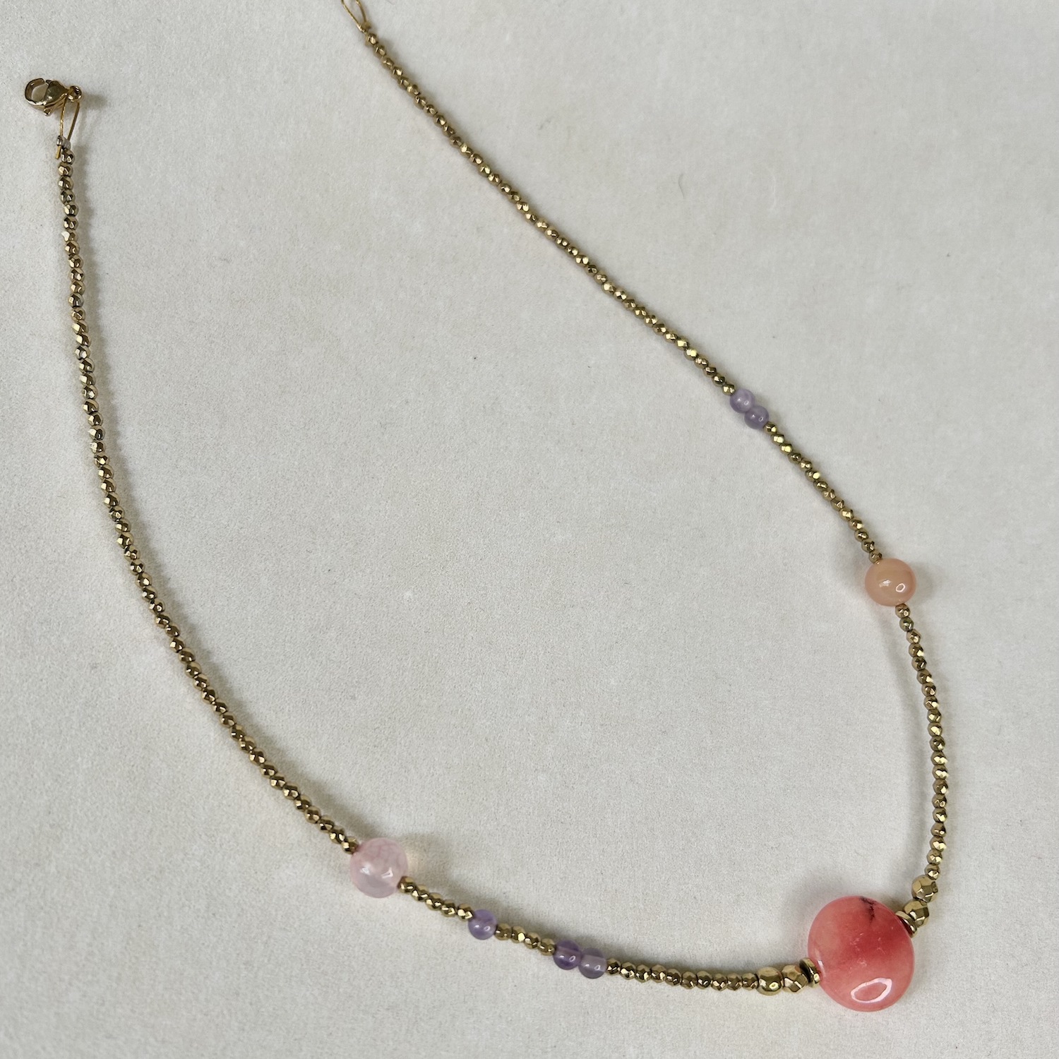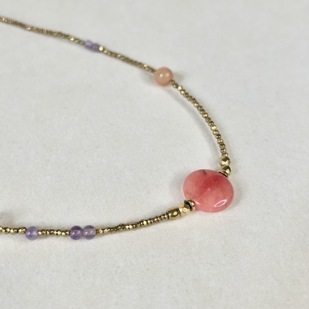 Κολιέ από χρυσό αιματίτη και στρογγυλές πέτρες νεφρίτη και αμέθυστου. Το μήκος του κολιέ μεγαλώνει ή μικραίνει ανάλογα με το πως σας αρέσει να το φορέσετε κάθε φορά.